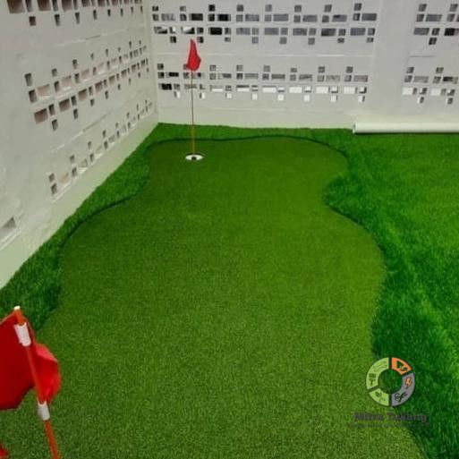 Rumput sintetis dipilih sesuai standar permainan golf untuk memastikan bola bergulir sempurna. -